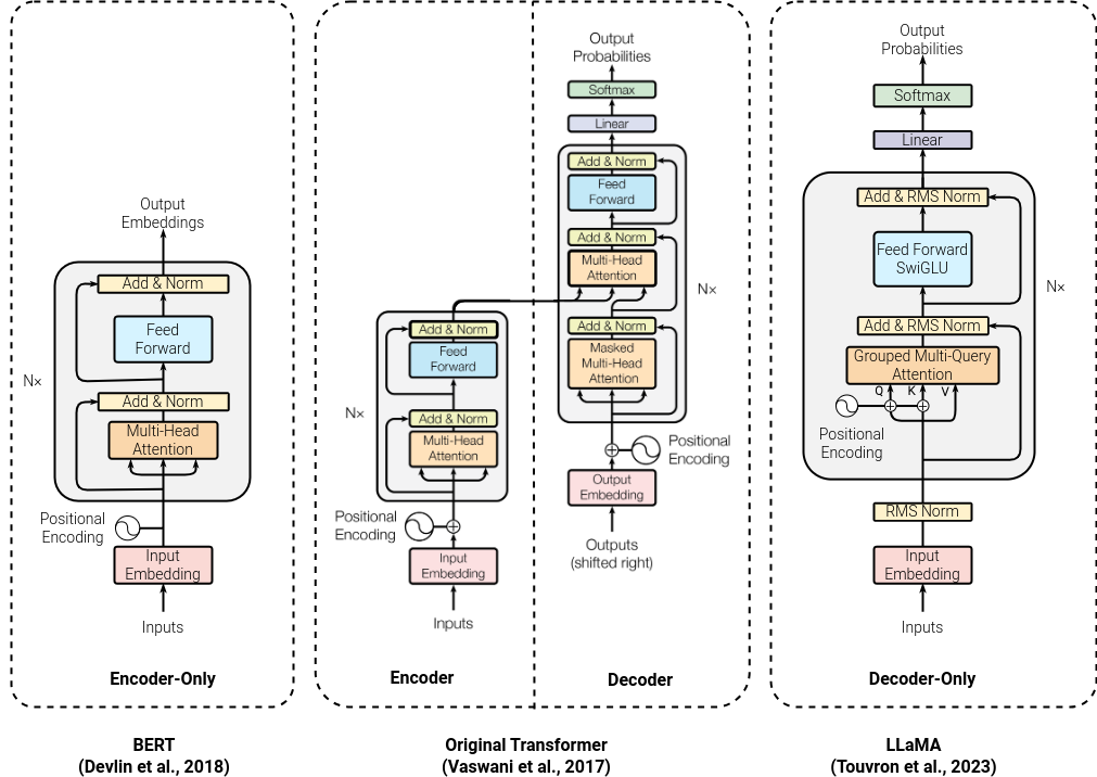 Comparison between architectures of influential models from different modelling methods. (from left to right) BERT is an MLM, Original Transformer is a Seq2Seq model, and LLaMA is a CLM.