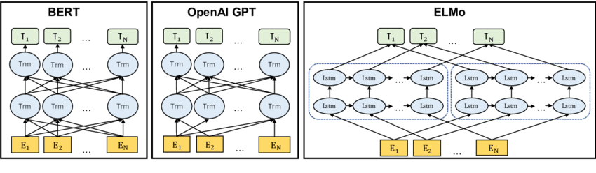 Differences between attention direction. BERT uses a bi-directional Transformer. OpenAI GPT uses a unidirectional left-to-right Transformer