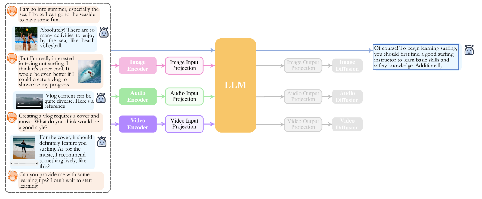 Extending the reach of LLMs even further is the integration of multiple modalities, such as vision and audio. These components convert inputs like images or sound into latent representations, a universal language that our LLM understands.